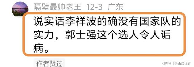 “说实话李祥波的确没有国家队的实力,郭士强这个选人令人诟病。”;“郭士强选人用人太离谱了!完全不是一个国家队教练的眼光!”;“明摆着就夾带私货,让他到国家隊镀一镀金好在俱乐部要个好价钱!”;“李祥波竟然能两次进国家队,唉!我服了。”……