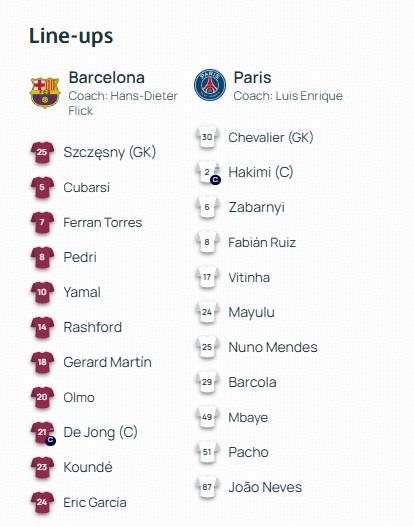 巴萨vs巴黎:佩德里PK维蒂尼亚;亚马尔、拉什福德出战